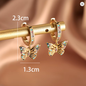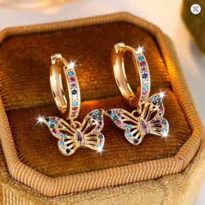 Add a touch of garden-inspired magic to your look. These exquisite gold-toned huggie hoops feature a delicate, filigree butterfly charm that dances with every movement. Inlaid with a vibrant kaleidoscope of colorful crystals, these earrings are designed to capture the light and celebrate your unique spirit. Whether you’re dressing up a casual day look or adding a pop of color to an evening ensemble, these butterflies are a symbol of transformation and beauty.