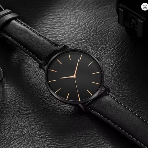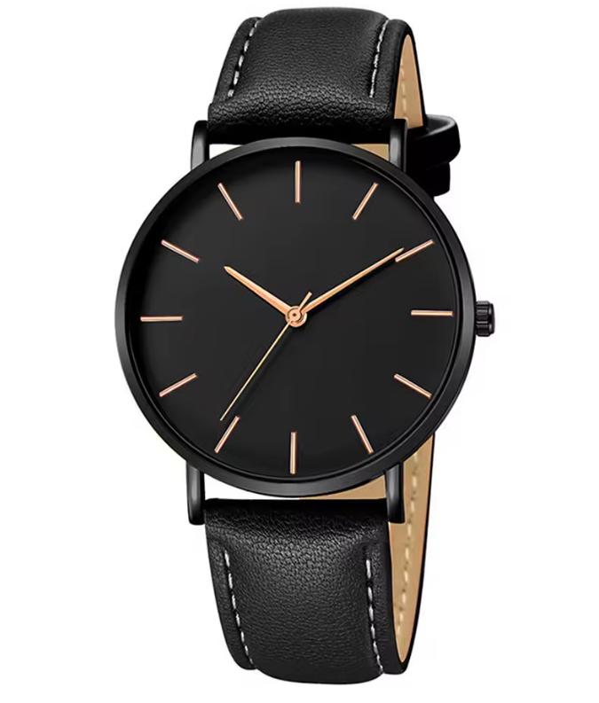 Timeless design meets everyday elegance. This minimalist wristwatch features a sleek matte black dial accented with refined rose-gold markers and hands for a subtle touch of sophistication. The slim black case creates a modern silhouette, while the soft genuine leather strap ensures lasting comfort throughout the day.